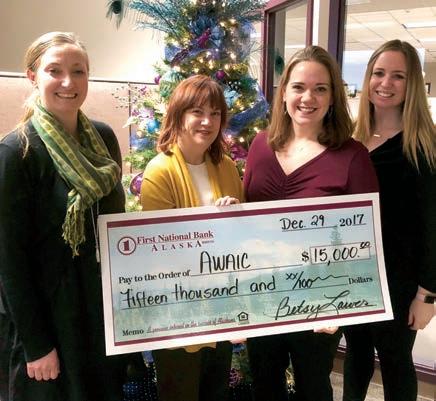 Alaska communities across the Great Land received more than $1 million in donations and community sponsorships in 2017. This included a donation to AWAIC’s capital campaign, and education and outreach programs. (l to r) First National Vice President Natasha Pope, AWAIC’s Executive Director Suzi Pearson and Development Director Becky More, and First National Marketing Manager Amy Tannahill.