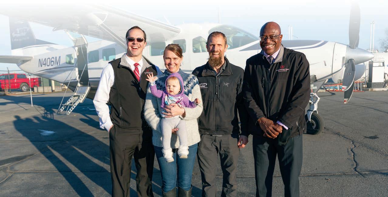 Providing passenger, cargo and emergency services, Lake and Peninsula Airlines is a vital lifeline to Southwest Alaska. To help navigate an always-changing economy, second-generation business owners Heidi and Lyle Wilder trust First National for a team of bankers dedicated to their success, a century of local expertise, and customized lending to take their business to new heights. From left to right: First National Loan Officer Jake Parrish, Heidi Wilder, Lyle Wilder, First National Branch Manager Syl Fowlis.