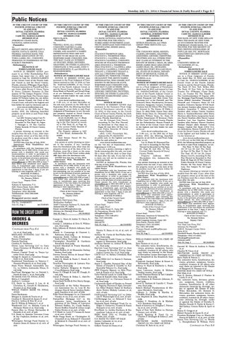 FROM THE Circuit COURT ORDERS & DECREES Continued from Page B-6 vir, et al, final judg MIDLAND FUNDING LLC VS: FINAL JUDG Bonnie Christopher Pamela Starling Cynthia H. Newberry Ocwen Loan Servicing LLC vs. Gary Dean Christner & Winifred A. et al, final judg Protean Capital Trust vs. Tonya Lynette Price, final judg George R. Saoud vs. Cornelius Haugabook et al, final judg Southwind Townhomes vs. Tekeira C. Heastie-Wimberly et al, final judg State Farm Mutual Automobile Ins. Co. vs. Deltria Antionette Hines, final judg SunTrust Mortgage Inc. vs. Patrick L. Smith & Amy L. et al, final judg TD BANK USA VS: FINAL JUDG Melva J. Campbell Andrea L. Lewison U.S. Bank vs. Samuel S. Loy, Jr. & Christina K.; Gerald H. Henderson, Trustee et al, final judg WELLS FARGO BANK VS: FINAL JUDG Doris Buchanan Morgan A. Jacobs & Travis et al Cynthia E. Maxwell & James D. et al David A. Arthur & Kim M. et al Joel R. Miklas & Rebecca L. et al Woodcreek LLC vs. Melissa Curry & Melquan Steele et al, final judg Fannie Mae vs. Hiram Hernandez & Zoraida et al, cert. of sale U.S. Bank vs. Quintin Trevaras Crum & Joy Cephonia Jenkins et al, cert. of sale Wilmington Savings Fund Society vs. Jessica Jones & James et al, cert. of sale