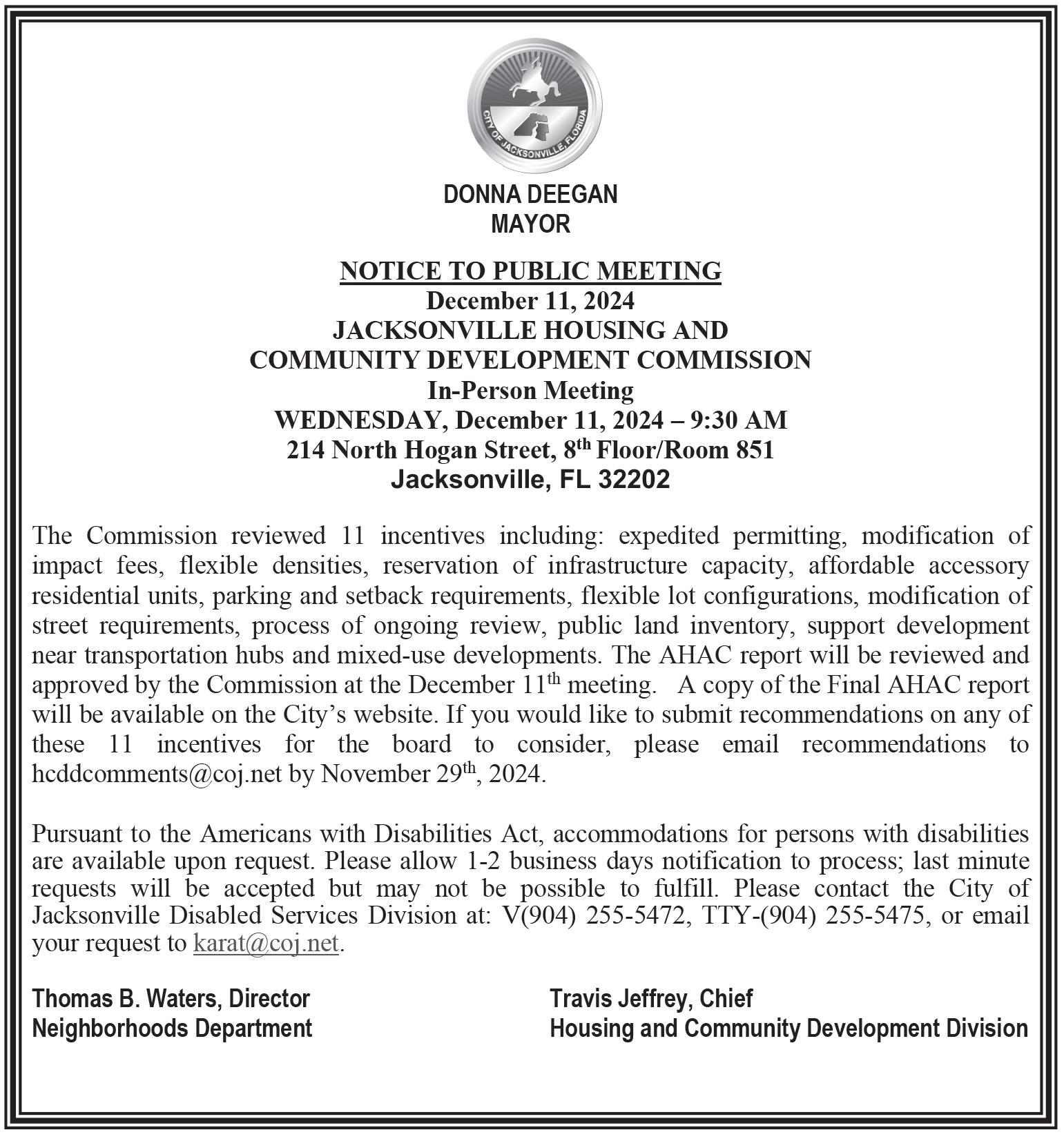 LEGAL ADVERTISING: Submit public notices via email to legal@JaxDailyRecord.com. List the county name in the subject line and attach notice. Deadline 2 p.m. Wednesday.