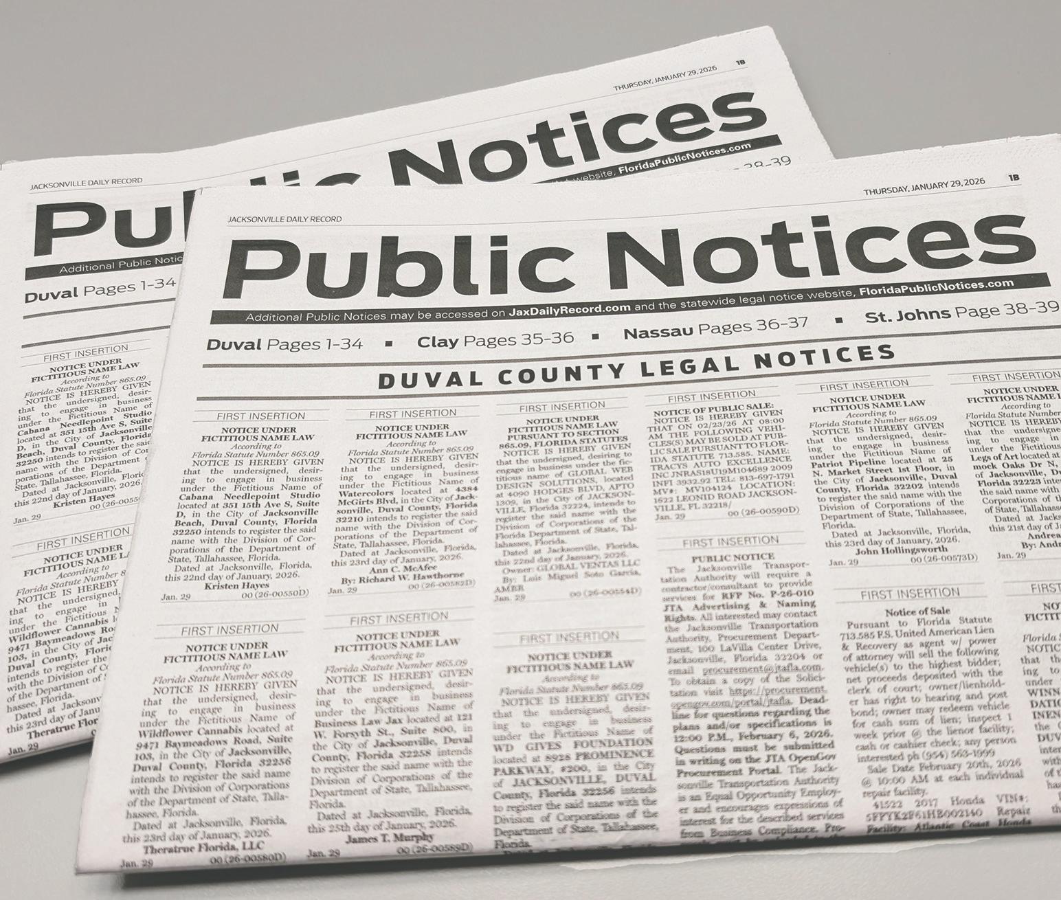 Established in 1912, the Jacksonville Daily Record is Northeast Florida’s newspaper for business leaders. Editorial content focuses on news and trends, with a concentration on development, real estate, construction, law, companies, economic and industry trends and how local and state government affects business. The Jacksonville Daily Record is the leading publisher of public notices in three Northeast Florida counties: Duval, Clay and St. Johns.