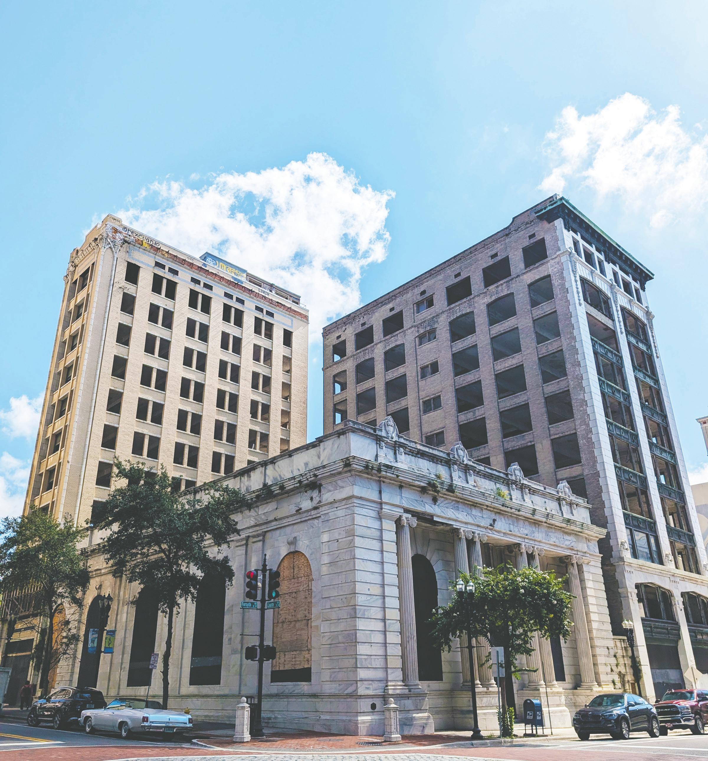 The Laura Street Trio of historic buildings at Forsyth and Laura streets in the core of Downtown Jacksonville. From left, they comprise the Florida Life, Old Florida National Bank, also known as the Marble Bank, and Bisbee buildings.