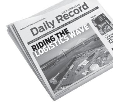 Established in 1912, the Jacksonville Daily Record is Northeast Florida’s newspaper for business leaders. Editorial content focuses on news and trends, with a concen tration on development, real estate, construction, law, companies, economic and industry trends and how local and state government affects business. The Jackson ville Daily Record is the leading publisher of public notices in three Northeast Florida counties: Duval, Clay and St. Johns.