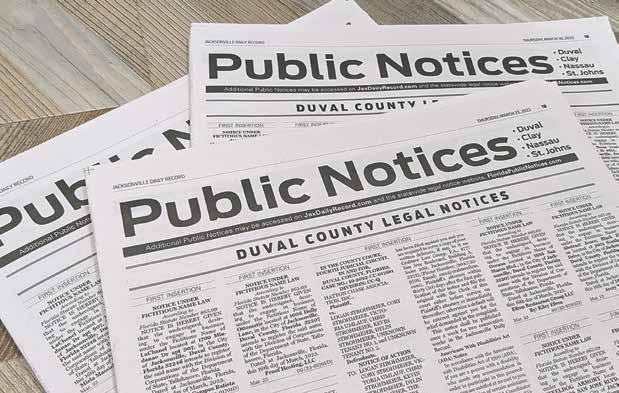 The Jacksonville Daily Record meets the legal requirements to publish legal notices in Duval, Clay and St. Johns counties, per F.S. 50.0111(1)(e). USPS Periodicals Permit (190-620)