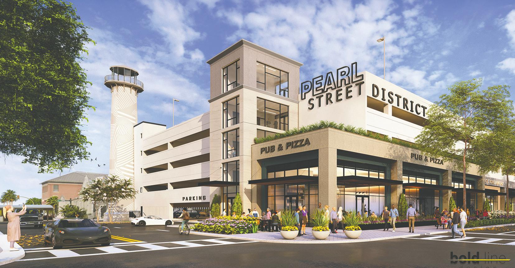 The five-story parking garage and its attached lighthouse will be retrofitted with storefronts as a development pad/ phase within the Pearl Street District multiphase site plan in the Church District of the Downtown Zoning Overlay. The project architect is Bold Line Design.