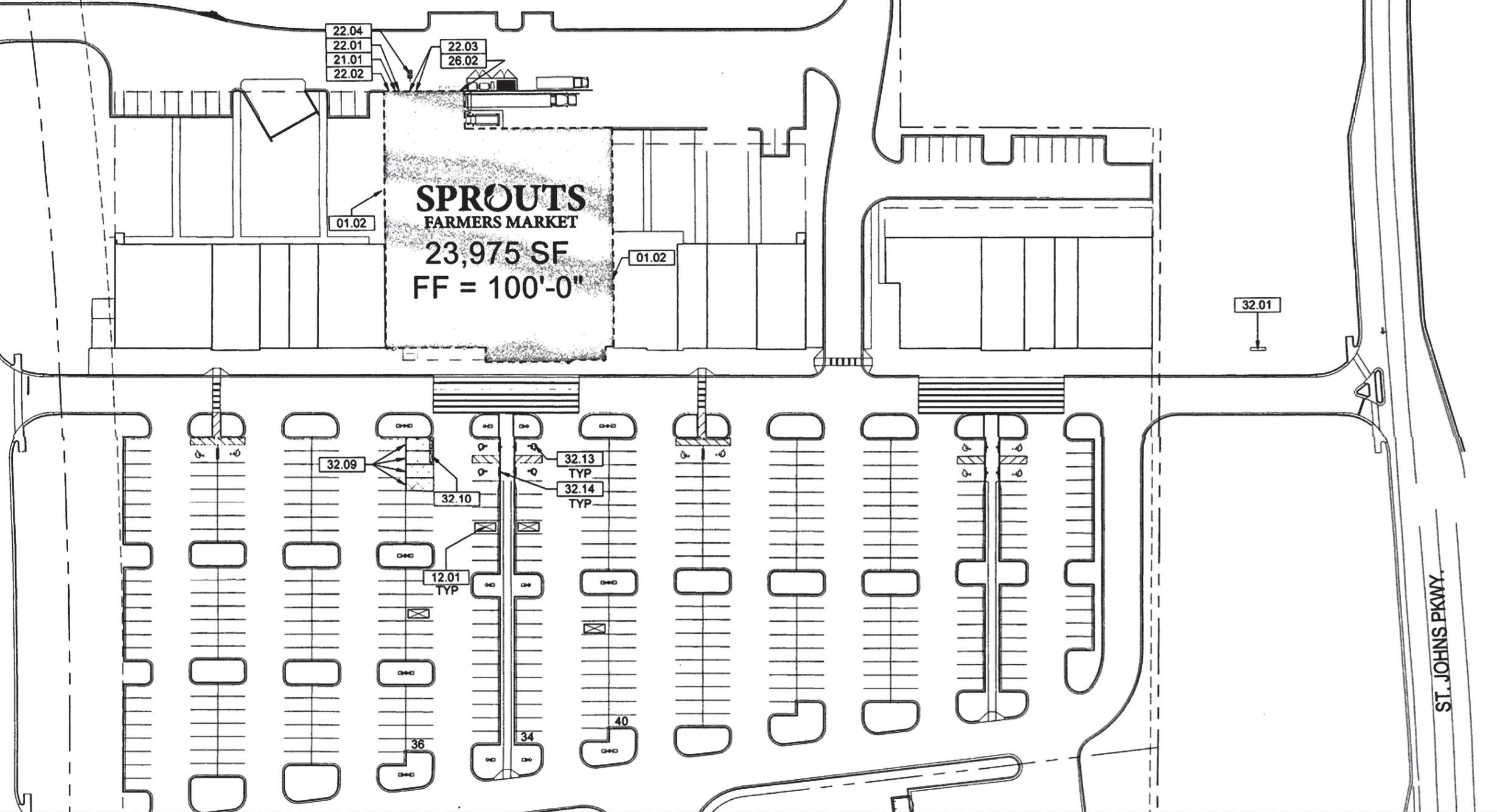 The site plan for the Sprouts Farmers Market in Shoppes of St. Johns Parkway at 120 Shops Blvd. near County Road 210. It will fill the space that was built for Earth Fare, a similar concept that closed in 2022.