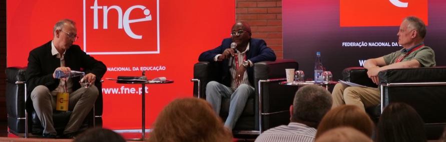 Seguiu-se o painel “Os sindicatos na vanguarda por uma educação de Qualidade”, moderado por Alexandre Dias e Joaquim Santos, ambos da FNE, com intervenção das doze organizações sindicais convidadas, que deixaram relatos individuais do quadro sindical em que vive a educação de cada umdosseuspaísesdeorigem.
