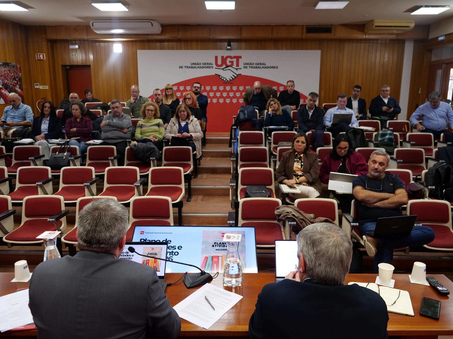 Um Auditório Manuela Teixeira, na sede da UGT, em Lisboa, completamente repleto, foi o palco do FÓRUM FNE 2025, que decorreu durante a manhã e tarde de 8 de novembro de 2025, sob o lema “Em Duas Palavras: Carreiras Valorizadas”