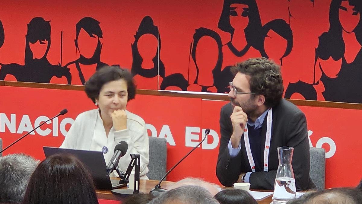 Pelas 11h30 deu-se início ao “Olhar sobre o sistema educativo português”, numa apresentação conjunta de Pedro Freitas, investigador associado da Universidade de Oxford, e Ana Balcão Reis, Professora da NOVA SBE A Professora da NOVA SBE começou por se referir a quem são os alunos e quem são os professores, nomeando duas grandes melhorias em Portugal: a taxa de alfabetização (que melhorou imenso nas últimas décadas, logo: pais mais alfabetizados) e o abandono escolar precoce