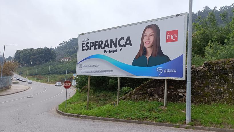 É caso para dizer que "a Esperança anda na rua e nas escolas" A candidata virtual da FNE Maria Esperança Portugal saiu à rua a 21 de fevereiro de 2024 com a colocação em Braga, Famalicão, Santa Maria da Feira e Viana do Castelo dos primeiros outdoors de divulgação desta candidatura fictícia.