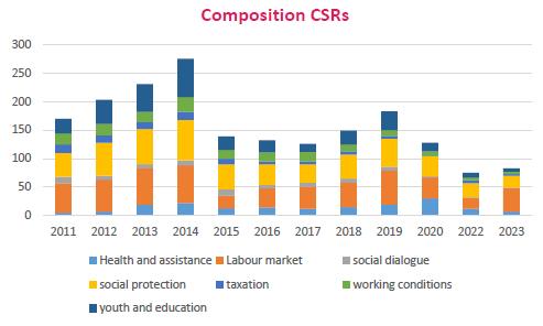 Silvia Rainone (ETUI) apresentou uma “Visão Geral das Recomendações Sociais Específicas por País”, que envolvem sete áreas macro: condições de trabalho, diálogo social, mercado laboral, juventude e educação, proteção social, saúde e assistência e impostos. Em 2023, a quota maior das recomendações recaiu em aspetos relacionados com o mercado laboral, seguido da proteção social. De realçar que a juventude e educação têm sido alvo de recomendações por parte da CE de uma forma constante, com um pico acentuado no ano de 2014: