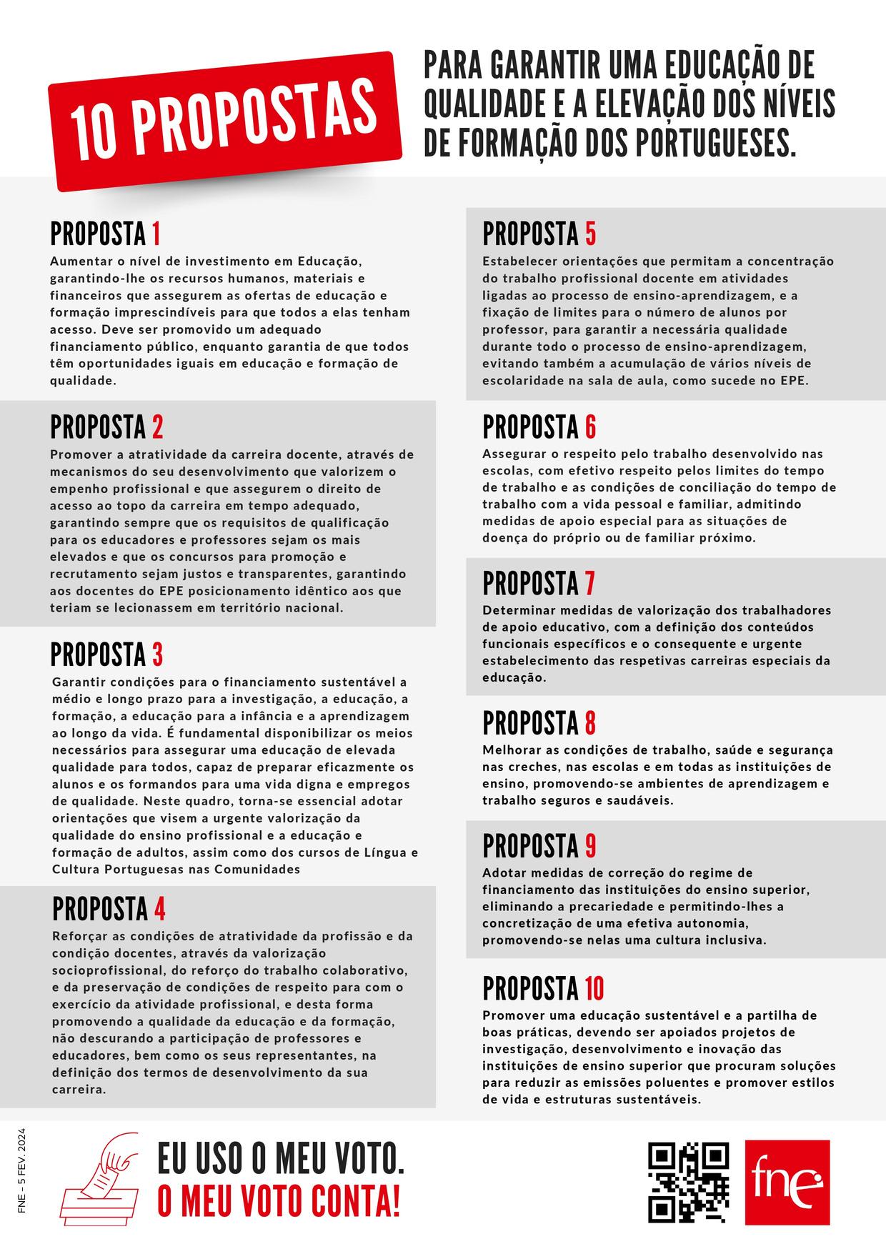 Estamos a trabalhar no roteiro para a legislatura, que apresentaremos oportunamente ao governo que sair das eleições de 10 de março de 2024 Até ao dia 16 de fevereiro, todos os professores, comunidade educativa e outros interessados tiveram a oportunidade de contribuir para a construção deste roteiro, dando a sua opinião, o seu contributo, através do site oficial da FNE, www.fne.pt . Queremos uma educação de qualidade, entendida como um direito humano, uma educação inclusiva que promova a equidade, quer na escola, quer na sociedade Queremos um estatuto social valorizado para todos os docentes e carreiras reconhecidas, dignificadas e valorizadas para todos os trabalhadores da Educação