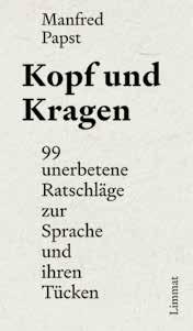 Manfred Papst Kopf und Kragen 99 unerbetene Ratschläge zur Sprache und ihren Tücken ca. 200 Seiten, gebunden ca. sFr. 30.– / € 26.–ISBN 9783 039261079 WG 1 118