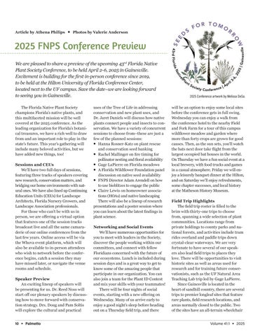 will be an option to enjoy some local sites before the conference gets in full swing. Wednesday you can enjoy a walk from the conference hotel to the nearby Field and Fork Farm for a tour of this campus wildflower meadow and garden where more than forty crops are grown for good causes. Then, as the sun sets, you’ll watch the bats next door take flight from the largest occupied bat houses in the world. On Thursday we have a fun social event at a local brewery, with food trucks and games in a casual atmosphere. Friday we will enjoy a leisurely banquet dinner at the Hilton, and on Saturday we’ll enjoy refreshments, some chapter successes, and local history at the Matheson History Museum. Field Trip Highlights The field trip roster is filled to the brim with thirty-one trips to choose from, spanning a wide selection of plant communities. Locations range from private holdings to county parks and national forests, and activities include tram rides overland and paddle trips down crystal-clear waterways. We are very fortunate to have several of our speakers also lead field trips to places they love. There will be opportunities to visit historic sites as well as areas used for research and for training future conservationists, such as the UF Natural Area Teaching Lab trip led by Gage LaPierre. Since Gainesville is located in the heart of sandhill country, there are several trips to premier longleaf sites that feature rare plants, field research locations, and areas normally closed to the public. Two of the sites have an all-terrain wheelchair Volume 41:1 ● 2025