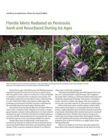 During the ice ages of the Pleistocene, the Florida peninsula regularly expanded to twice its current size as glaciers grew near the planet’s poles, only to be reduced to a series of islands as melting ice returned to the sea during warm periods. All told, glaciers advanced and retreated 17 times, and according to a new study (link: https://doi.org/10.1111/jbi.14541), the resulting environmental instability may have contributed to the incredible plant diversity found in Florida today. Researchers from the Florida Museum of Natural History came to this conclusion while studying scrub mints, a unique group of plants endemic to the southeastern U.S. that radiated during the ice ages. Cyclically marooned on isolated islands as seas rose and fell, mint populations became genetically isolated and diverged over time, generating multiple new species. Despite their long winning streak, scrub mints have recently been hit head on with the threat of extinction due to human-mediated habitat destruction and impending climate change. Of the 13 species endemic to Florida, 8 are listed as