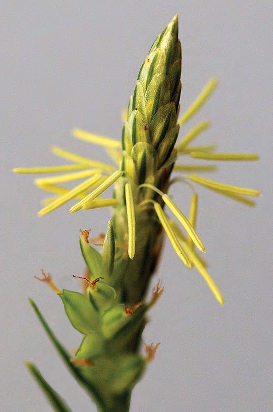 tufts. In March and April, several culms with seed heads arise above the leafy tuft where birds and small mammals snack on them as food. The terminal spike in the seed head has stamens shedding pollen that fall by gravity onto the stigmas of the lower female spikes with perigynia (Figure 1). According to the Atlas of Florida Plants, Chapman’s sedge is listed as a threatened species in Florida, and it is protected in parks and preserves. More common are Godfrey’s sedge (C. godfreyi ) and Gholson’s sedge (C. gholsonii ), which also have a terminal spike with yellow stamens. C. godfreyi has impressed veins on the perigynia while others have raised veins (Figures 2–4).