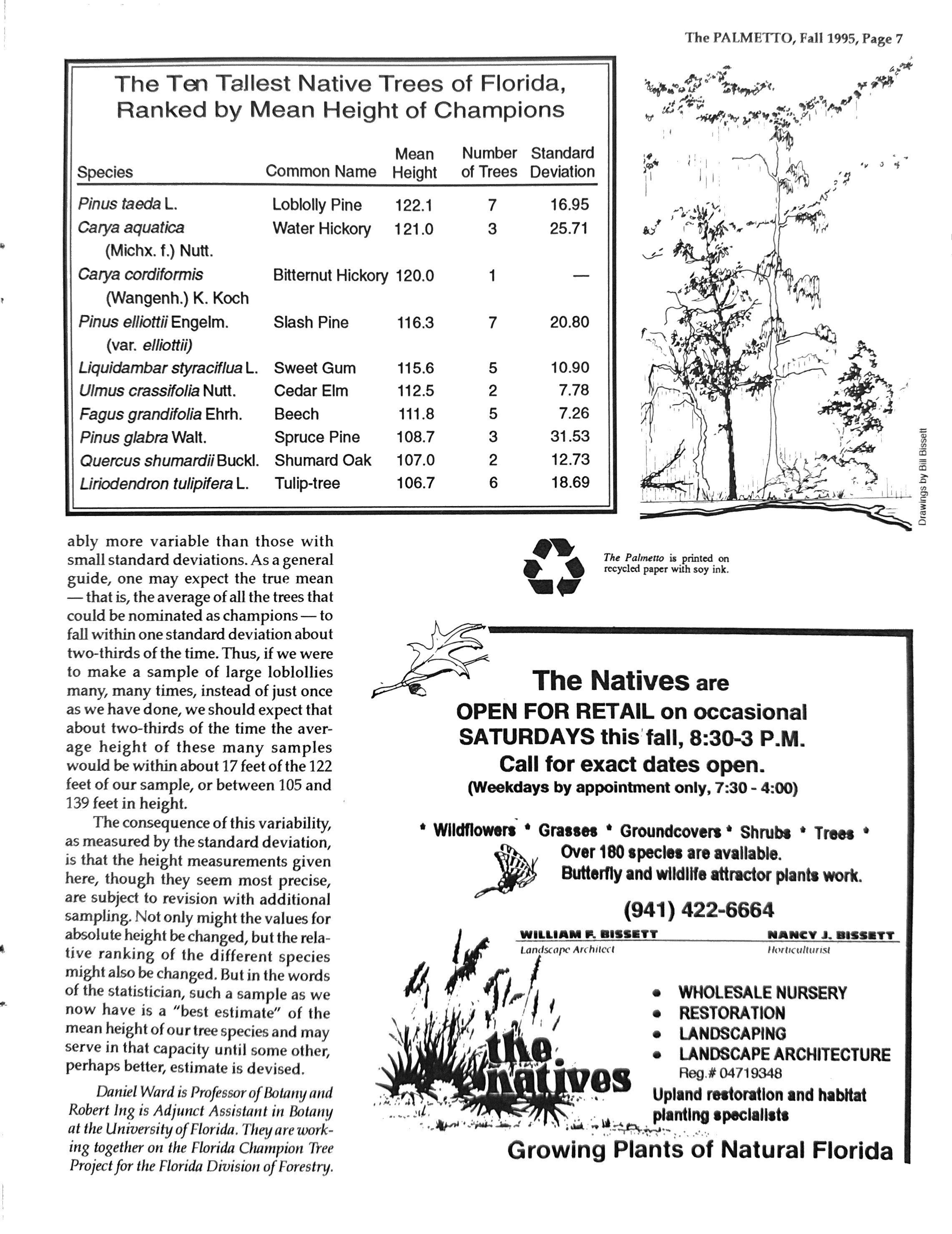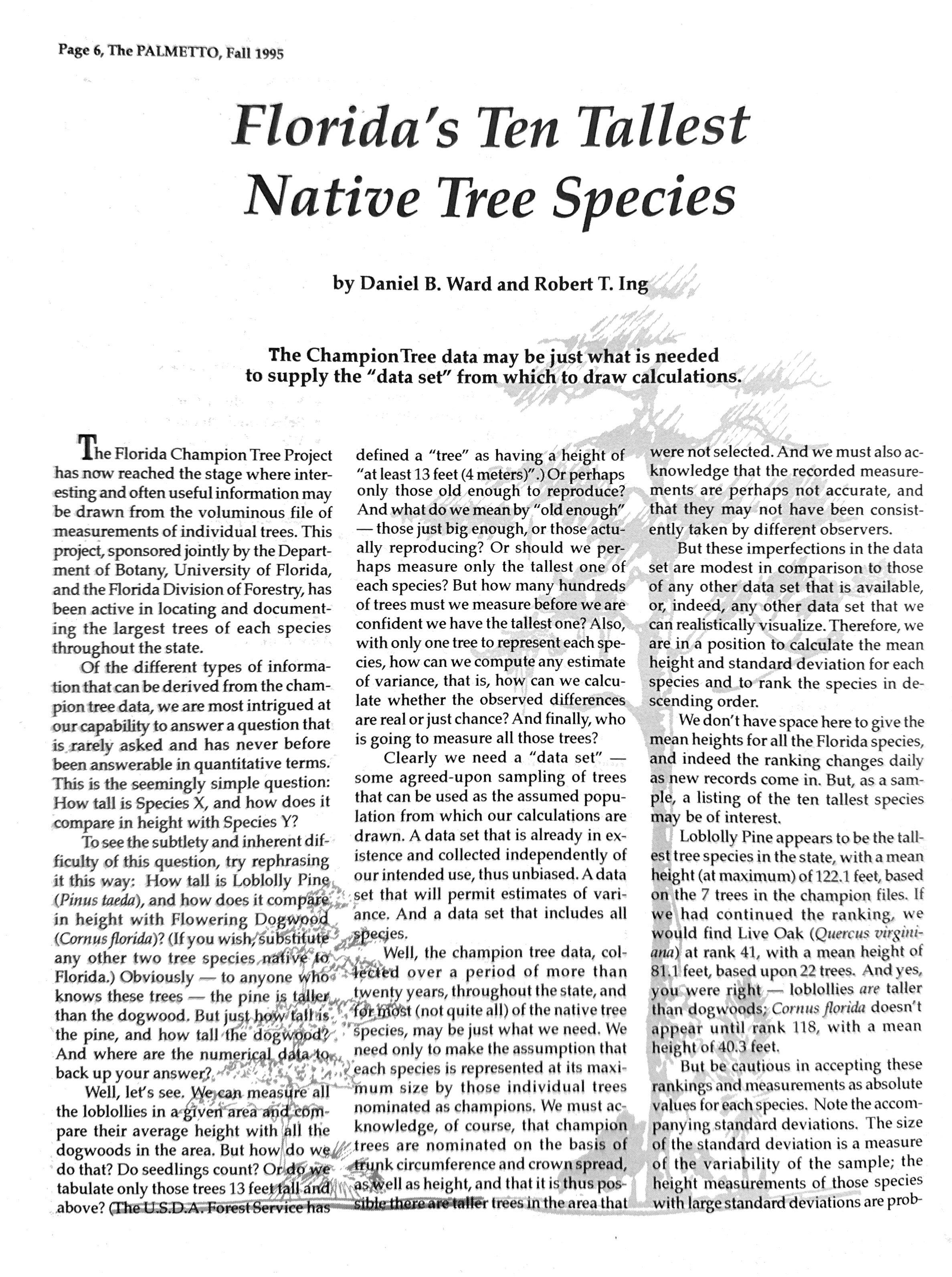 The Florida Champion Tree Project defined a "tree" as having a height of has now reached the stage where inter- "at least 13 feet (4 meters)".) Or perhaps esting and often useful information may only those old enough to reproduce? be drawn from the voluminous file of And what do we mean by "old enough" measurements of individual trees. This ? those just big enough, or those actuproject, sponsored jointly by the Depart- ally reproducing? Or should we perment of Botany, University of Florida, haps measure only the tallest one of and the Florida Division of Forestry, has each species? But how many hundreds been active in locating and document- of trees must we measure before we are ing the largest trees of each species confident we have the tallest one? Also, throughout the state. with only one tree to represent each spe-