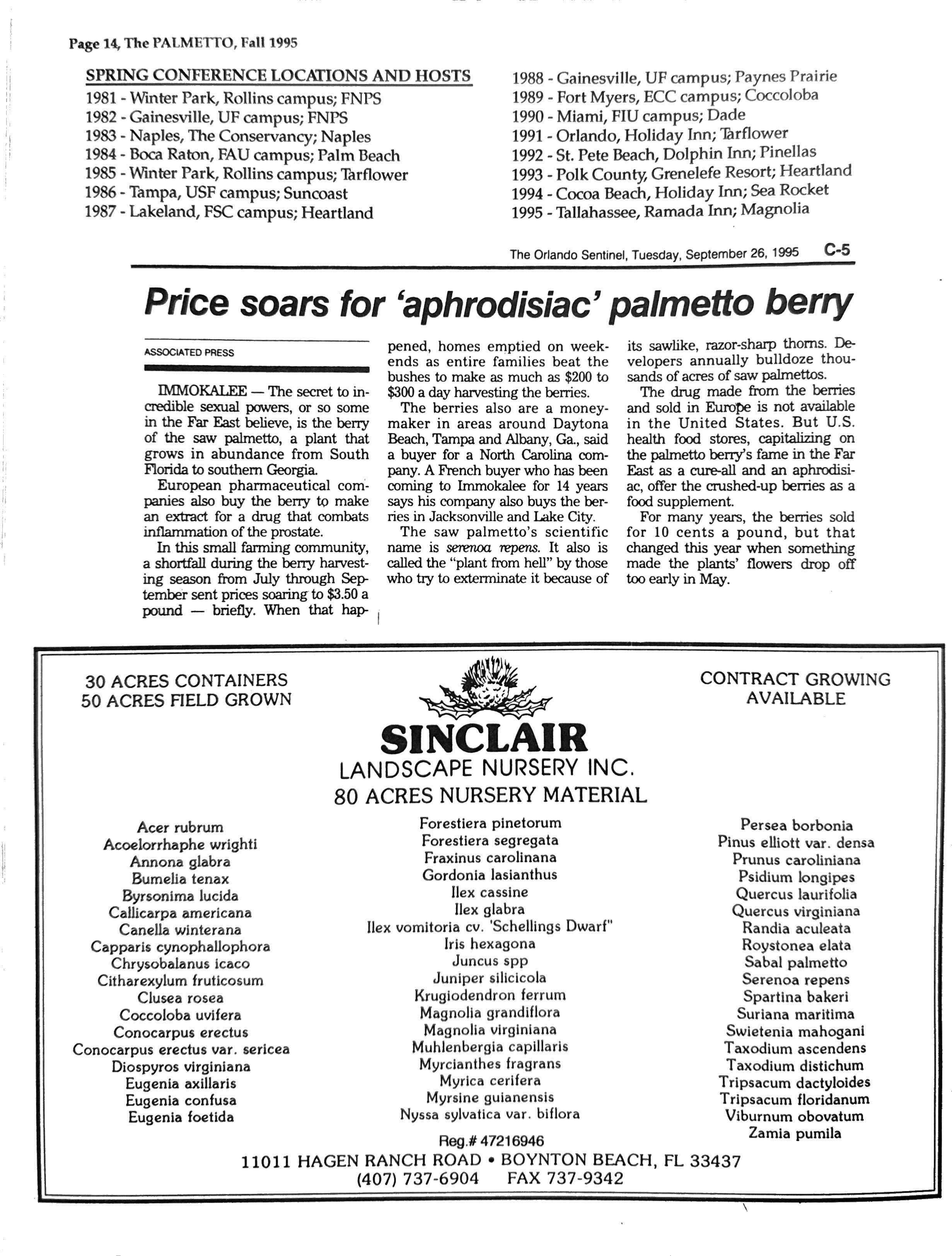 We encourage the reuse of the articles appearing in The Palmetto in order to disseminate information on Florida native plants as widely as possible; but, in accordance with the copyright law, permission must be granted in writing by the Editor or the Publisher, credit must be given to The Palmetto and the Florida Native Plant Society, and the notice of copyright must appear in the reprinted article.