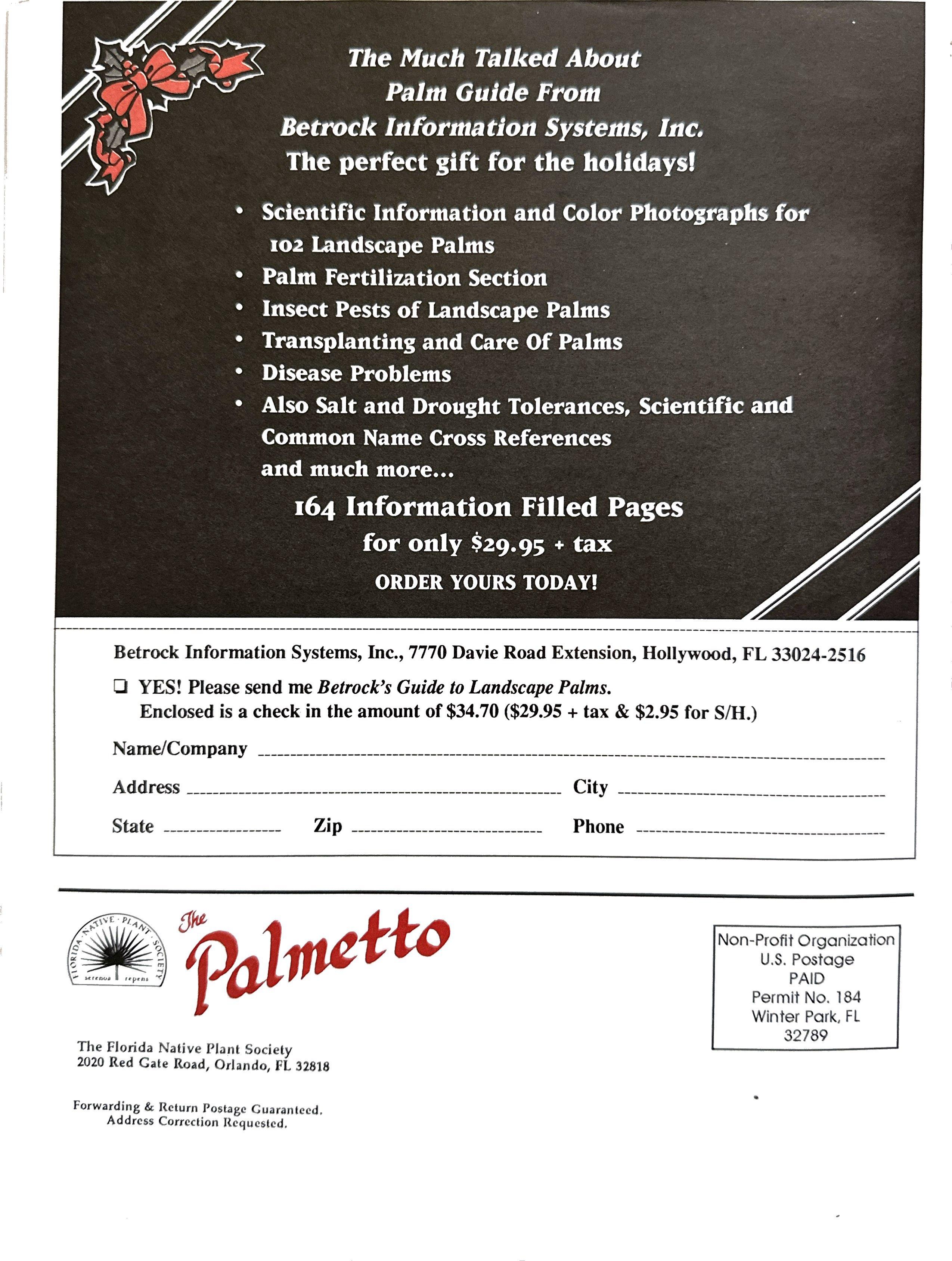 The Palmetto is published quarterly by the Florida Native Plant Society as a membership benefit. Memberships are: Individual, $20; Double, $25; Organizational, $50; Supporting, $100; Donor, $250; Library, $10.