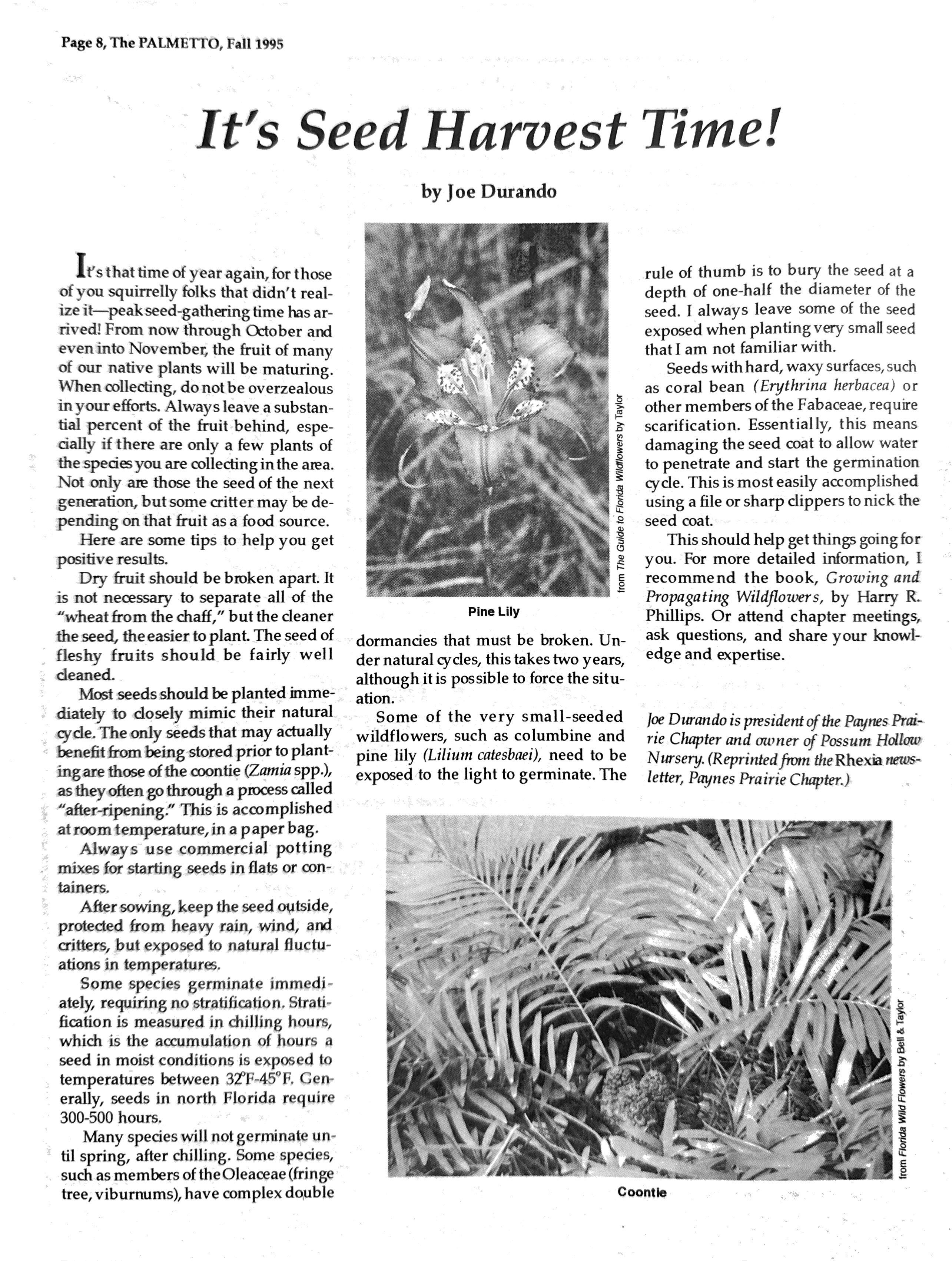 Articles on any aspect of Florida native plants are invited. Include drawings or photos, if possible. They will be handled with care, and will be returned if you include a self addressed, stamped envelope. Send to Peggy S. Lantz, The Palmetto, 2020 Red Gate Road, Orlando, FL 32818. Phone: 407/299-1472.
