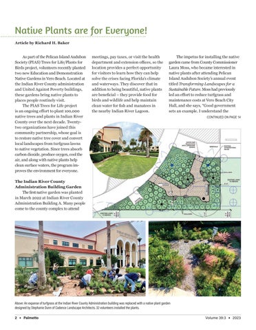 meetings, pay taxes, or visit the health department and extension offices, so the location provides a perfect opportunity for visitors to learn how they can help solve the crises facing Florida’s climate and waterways. They discover that in addition to being beautiful, native plants are beneficial – they provide food for birds and wildlife and help maintain clean water for fish and manatees in the nearby Indian River Lagoon.