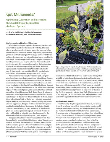to expand our living collection and ex-situ seed production for all three Asclepias species. Our ultimate goal with this project was to make this plant available to local butterfly gardeners and restoration projects. Albeit still on a limited basis, we have met and plan to continue meeting this goal by growing and distributing more milkweed plants to both local homeowners and organizations for use in native plant gardening and restoration projects throughout Miami-Dade County.