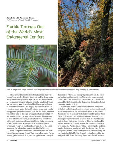I hike across the sandhill bluff, my backpack heavy as longleaf pine needles shimmer above me, and the dense, spiky wiregrass brushes against my legs. The sun warms my cheeks as I peer across the open vista and kick off a small pricklypear pad stuck to my boot. From the tall bluff, I can spot a glimpse of blue in the distance – the mighty Apalachicola River. As I continue on my path, the land begins to slope gently, and a canopy of the gnarled branches of sand live oak twists above me. Suddenly, I come to the edge, a steep and sharp drop of 50-80 feet into the ravine. The sand gives beneath my feet as I begin to slide into another world, a dense hardwood slope forest with a lush understory of mosses and ferns that creep among a cool, clear stream. Nestled in these unique steephead ravines, an evergreen tree found nowhere else in the world teeters on the brink of extinction: the Florida Torreya. Since European colonization, Torreya taxifolia has been known by many names: Florida Torreya, stinking cedar, Florida nutmeg, polecat wood, fetid yew, and gopherwood. Many of ●