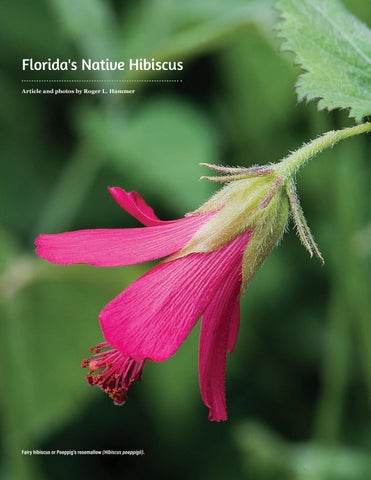 A nd finally, we come to the oddball of the group, called fairy hibiscus or Poeppig’s rosemallow (Hibiscus poeppigii), named to commemorate German zoologist and botanist Eduard Friedrich Poeppig (1798–1868). The small, bright red flowers of this species are pendulous and I love watching hummingbirds performing aerial acrobatics as they try to access the nectar. It is a subshrub to about four feet tall and, in Florida, is restricted to Miami-Dade and Monroe counties, both mainland and the Florida Keys (see photo on page 12).