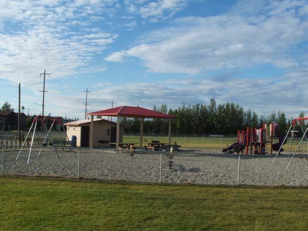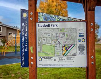 This park was the first park of the Borough’s Capital Improvement Program (CIP) Small Park Replacement project and was fully completed in 2022. The Borough received grant funding from the Rasmusson Foundation to renovate parts of the existing park. Partners such as the Tanana Chiefs Conference even donated funding to put towards the new renovations. Bluebell playground received new equipment such as a small rock climbing play piece, a new playhouse structure, accessibility improvements and new park signage.