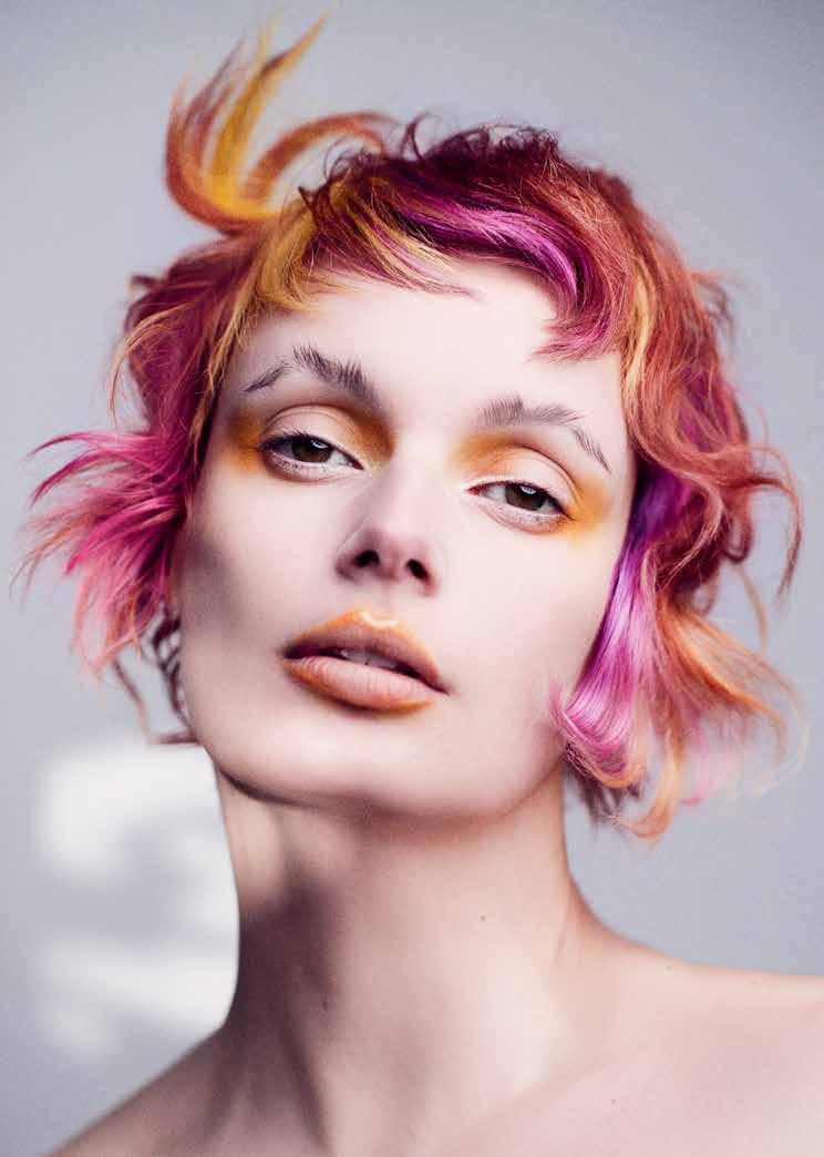 Bert: “De kleuren zijn gepersonaliseerd per model. Ik heb gekeken naar de valling in het haar en er schaduwen in aangebracht om diepte te creëren en met lichtere accenten volume gemaakt. Pastels zijn met een freehand techiek aangebracht op een ontkleurde ondergrond.”
