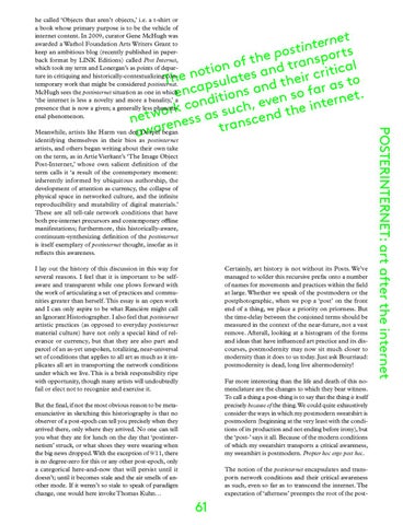 artists, and others began writing about their own take on the term, as in Artie Vierkant’s ‘The Image Object Post-Internet,’ whose own salient definition of the term calls it ‘a result of the contemporary moment: inherently informed by ubiquitous authorship, the development of attention as currency, the collapse of physical space in networked culture, and the infinite reproducibility and mutability of digital materials.’ These are all tell-tale network conditions that have both pre-internet precursors and contemporary offline manifestations; furthermore, this historically-aware, continuum-synthesizing definition of the postinternet is itself exemplary of postinternet thought, insofar as it reflects this awareness. Certainly, art history is not without its Posts. We’ve managed to solder this recursive prefix onto a number of names for movements and practices within the field at large. Whether we speak of the postmodern or the postphotographic, when we pop a ‘post’ on the front end of a thing, we place a priority on priorness. But the time-delay between the conjoined terms should be measured in the context of the near-future, not a vast remove. Afterall, looking at a histogram of the forms and ideas that have influenced art practice and its discourses, postmodernity may now sit much closer to modernity than it does to us today. Just ask Bourriaud: postmodernity is dead, long live altermodernity!