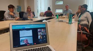 We decided to set up two pathways to offer as much choice as we could and to two approaches to hybrid. One, using our conferencing facilities, in which online participants can virtually see our presenter in the room as they present to those in person, and can hear everything using a speaker system. The second, a more traditional hybrid approach in which the in-person participants joined together in a room, watched and listened through a big sceen and the presenter participated virtually. This allowed for in-person participants to interact with each other and with the presenter.
