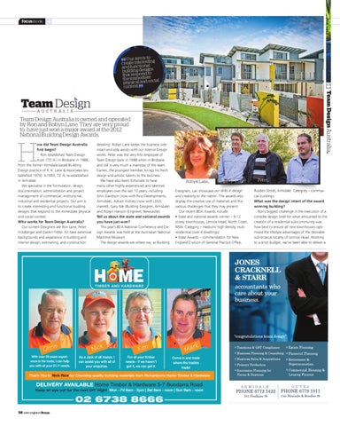 detailing. Robyn Lane keeps the business side intact and ably assists with our Interior Design works. Peter was the very first employee of Team Design back in 1988 when in Brisbane and still is very much a mainstay of the team. Darren, the youngest member, brings his fresh design and artistic talents to the business. We have also been fortunate to have many other highly experienced and talented employees over the last 10 years, including John Davidson (now with Rice Developments, Armidale), Adrian Vickery (now with LEGS, Inverell), Gary Ible (Building Designer, Armidale) and Roslyn Hanson (Engineer, Newcastle). Tell us about the state and national awards you have just won? This year’s BDA National Conference and Design Awards was held at the Australian National Maritime Museum. The design awards are where we, as Building
