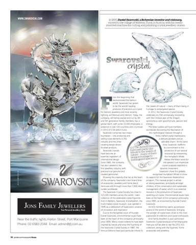 rom this beginning that revolutionised the fashion world, Swarovski has grown the ‘jewels of nature’ – many of them being in to be the world’s leading homage to endangered species. producer of precision-cut crystal In 2012, the Swarovski Crystal Society for fashion, jewellery and more recently celebrates its 25th anniversary, resonating lighting, architecture and interiors. Today, the with the Chinese year of the Dragon, company, still family-owned and run by 4th synonymous with good fortune, passion and and 5th generation family members, has a energy. global reach, with some 23,000 employees, a The Silver Jubilee will have members presence in over 120 countries and a turnover worldwide discovering the fascination of in 2010 of 2.06 billion Euros. this mythological creature through a Swarovski comprises two major finely crafted crystal masterpiece, businesses – one producing and a delicate pendant and an selling loose elements to the adorable charm. At the same industry and the other time, Swarovski reaffirms creating design-driven itions its commitment to the The Annual Edar finished products. ul have paid part‘jeicwels of protection of our natural Swarovski crystals tribute to the y of them resources by interpreting have become an an nature’ – m age to the Humpback Whale. essential ingredient of m ho in g bein ies. Paikea (the Maori word for international design. endangered spec the species) is an impressive Since 1965, the company crystal sculpture depicted in has also catered to the dynamic movement. fine jewellery industry, with Swarovski chose the globally precision-cut genuine and recognised Humpback Whale to show created gemstones. its support for the Swarovski Waterschool Showing the creativity that lies at the heart program. This massive project is aimed of the company, Swarovski’s own brand lines at raising awareness, principally amongst of accessories, jewellery and home décor children, of the conservation and sustainable items are sold through more than 1,900 retail management of water, which is an essential outlets worldwide. resource in the production of Swarovski The Swarovski Crystal Society has close to sparkling cut crystal. Environmental issues have 325,000 members across the world – keen been at the heart of the company’s philosophy collectors of the celebrated crystal figurines. since 1895, as envisioned by founder Daniel And in Wattens, Swarovski Kristallwelten, the Swarovski. multi-media crystal museum, was opened in An SCS membership opens up exclusive 1995 as a celebration of Swarovski’s universe access to the world of Swarovski, bringing of innovation and inspiration. the wonder of crystal even closer to the most Due to the farsighted vision of founder passionate of collectors and crystal enthusiasts. Daniel Swarovski, environmental issues have Jons Family Jewellers is your authorised been at the heart of the company’s philosophy since 1895. Many crystal collections have been Swarovski Crystal boutique in Port Macquarie. Here you will be able to see the 2012 SCS inspired by nature and since the founding of collection, along with the figurines, home the Swarovski Crystal Society in 1987, the accessories and jewellery. Annual Editions have paid particular tribute to
