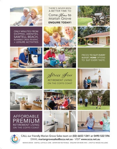 PRICES TO SUIT EVERY BUDGET, HOME OPTIONS TO SUIT EVERY TASTE. SAWTELL CATHOLICCAR E CALL our friendly Marian Grove Sales team on (02) 6653 1241 or 0490 522 596 EMAIL mariangrovesales@scca.net.au - VISIT www.scca.net.au MARIAN GROVE - SAWTELL CATHOLIC CARE - DEPARTURE FEE PAYABLE - ENQUIRE FOR MORE INFO - LIFESTYLE IMAGES INCLUDED THERE’S NEVER BEEN A BETTER TIME TO Come Home to Marian Grove ENQUIRE TODAY! ONLY MINUTES FROM SHOPPING, AMENITIES, SAWTELL BEACH, BOAMBEE CREEK RESERVE, + LEISURE ACTIVITIES Stress Free RETIREMENT LIVING ON THE COFFS COAST AFFORDABLE PREMIUM RETIREMENT LIVING ON THE COFFS COAST