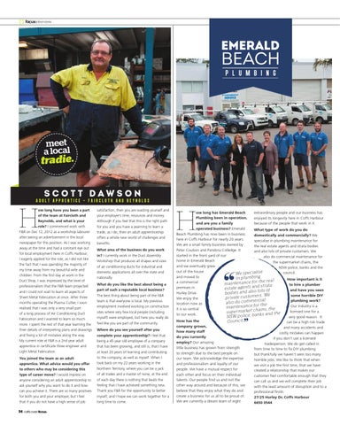 ow long has Emerald Beach extraordinary people and our business has Plumbing been in operation, enjoyed its longevity here in Coffs Harbour and are you a family because of the people that work in it. operated business? Emerald What type of work do you do Beach Plumbing has now been in business domestically and commercially? We here in Coffs Harbour for nearly 20 years. specialise in plumbing maintenance for We are a small family business owned by the real estate agents and strata bodies Peter Coulson and Pandora Colledge. It and also lots of private customers. We started in the front yard of our also do commercial maintenance for home in Emerald Beach the supermarket chains, the and we eventually grew NSW police, banks and the out of the house e lis ia council. We sp ec and moved to ng bi um in pl How important is it r th e re al a commercial m ai nt en an ce fo st ra ta to hire a plumber d premises in es ta te ag en ts an ts of and have you seen lo Hurley Drive. bo di es an d al so s. We some horrible DIY er om st pr iv at e cu We enjoy the al ci er plumbing work? m m co al so do location now as th e r fo ce Our industry is a an en nt m ai it is so central ai ns , th e ch t ke ar licensed one for a rm pe su to our work. nk s an d th e very good reason. It N SW po lic e, ba How has the Co un ci l.” can be a high risk trade company grown, and many accidents and how many staff costly mistakes can happen do you currently if you don’t use a licensed employ? Our amazing tradesperson. We do get called in little business has grown from strength from time to time to fix DIY plumbing to strength due to the best people on but thankfully we haven’t seen too many our team. We acknowledge the expertise horrible jobs. We like to think that when and professionalism and loyalty of our we visit a job the first time, that we have people. We have a mutual respect for created a relationship that makes our each other and focus on their individual customer feel comfortable enough that they talents. Our people find us and not the can call us and we will complete their job other way around and because of this, we with the least amount of disruption and to a believe that they enjoy what they do and professional finish. create a business for us all to be proud of. 27/25 Hurley Dr, Coffs Harbour We are currently a dream team of eight 6650 0544