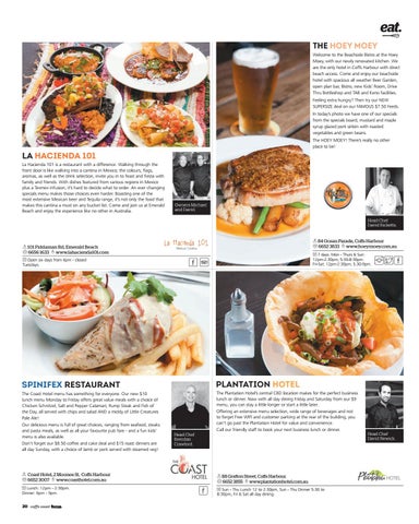 Welcome Welcome to to the the Beachside Beachside Bistro Bistro at at the the Hoey Hoey Moey with our newly renovated kitchen. Moey, with our newly renovated kitchen. We We are are the the only only hotel hotel in in Coffs Coffs Harbour Harbour with with direct direct beach beach access. access. Come Come and and enjoy enjoy our our beachside beachside hotel with spacious beer garden, hotel with spacious all weather Beer Garden, open plan bar, bistro, thru bottle Bistro, drive new Kids’ Room,shop Drive and facilities.and Have tried ourfacilities. new ThruTAB Bottleshop TAByou and Keno Gourmet Pizza range?Then Theretry is our a large selection Feeling extra hungry? NEW to choose from and you can have these eat SUPERSIZE deal on our FAMOUS $7.50 Feeds. in or takeaway. Come in and check out our In today’s photo we have one of our specials takeaway specials or phone ahead for pick-up. from the specials board, mustard and maple If a pizza is not what you are after our FAMOUS syrup glazed pork sirloin with roasted $7.50 FEEDS are always available daily. vegetables and green beans. The HOEY MOEY! There’s really no other place to be!