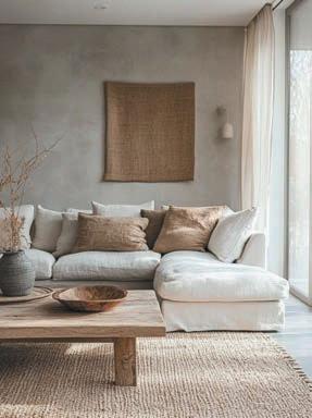 Picture this: a crisp white slipcover sofa, plump with relaxed linen cushions, floating atop a thick jute or wool rug that adds visual weight and sumptuous texture. Next to it, curved swivel armchairs in soft caramel or ochre velvet add warmth and contrast. The look balances laid-back and luxe, perfectly capturing how contemporary Australians live by the sea, relaxed, but design conscious. To round out the look, layer shiny, tactile surfaces like marble, travertine, concrete or polished stone with earthy artwork that mirrors our local landscapes. Abstract sanddune swirls, ocean horizon lines, and clayinspired sculptures all find a natural place in this new chapter of coastal style.