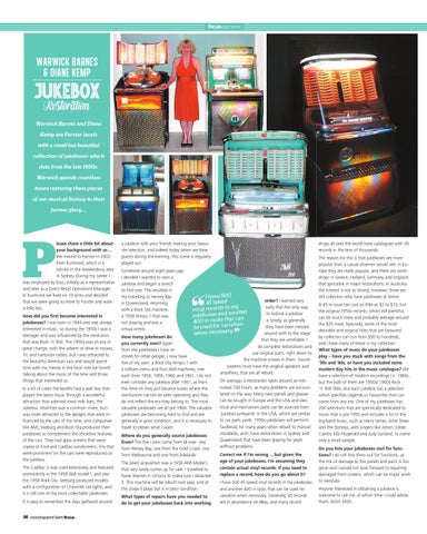 order? I learned very early that the only way to restore a jukebox is totally, as generally they have been messed around with to the stage that they are unreliable. I do complete restorations and use original parts, right down to the machine screws in them. Sound systems must have the original speakers and amplifiers, that are all rebuilt. On average, a restoration takes around an estimated 700 hours, as many problems are encountered on the way. Many new panels and glasses can be bought in Europe and the USA and electrical and mechanism parts can be sourced from ‘jukebox junkyards’ in the USA, which are similar to car parts yards. 1950s jukeboxes will perform faultlessly for many years when rebuilt to manual standards, and I have restorations in Sydney and Queensland that have been playing for years without problems. Correct me if I’m wrong ... but given the age of your jukeboxes, I’m assuming they contain actual vinyl records. If you need to replace a record, how do you go about it? I have 500 45 speed vinyl records in my jukeboxes and another 400 in racks that can be used for variation when necessary. Generally, 45 records are in abundance on eBay, and many record