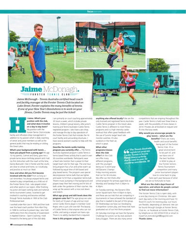 Jaime McDonagh – Tennis Australia certified head coach and facility manager at the Forster Tennis Club located on Lake Street, Forster explains the many benefits of tennis. If one of your New Year’s Resolutions is to work on your fitness, Cardio Tennis may be just the ticket! i Jaime. What’s your position with the club, and what does it involve on a day to day basis? My position with the Forster Tennis Club includes facility and office/pro shop management in addition to my passion which is daily coaching of senior and junior members as well as the general public that may be residing or visiting the Great Lakes. What’s your background with tennis ... have you played from a young age? At age 10 my parents, Carmel and Gerry, gave me a private tennis lesson birthday present and I had my first instruction with the coach at the time, Danny Biancardi. I live in Forster and the courts are close to school and home, so I could play and practice as much as I liked. How and when did you first become involved with the club? From as long as I can remember, I’ve always enjoyed tennis and started to play competitively as a child out of the Forster Tennis Club. I also played cricket and other sports in our region. After finishing my junior and open ranking state and national tennis tournament career, I wanted to get involved in coaching and became certified through Tennis Australia in 1993 at the Club Professional level. I worked under Ron Lee in 1993 and then took over the head coach position from Alan Fing in 1996 to continue to present day. I also hold certification from the University of Queensland in Applied Science – Sport Coaching. I look forward to the being part of the club daily. 40 manning-great lakes focus.