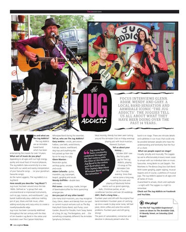 F O C U S I N T E RV I E W S G L E N N, A DA M , W E N DY A N D GA RY, A L O C A L B A N D S E N S AT I O N A N D A R M I DA L E I C O N I C “ T H E J U G ADDICTS”. THE JUGGIES TELL U S A L L A B O U T W H AT T H E Y H AV E B E E N D O I N G OV E R T H E PA S T 14 Y E A R S …