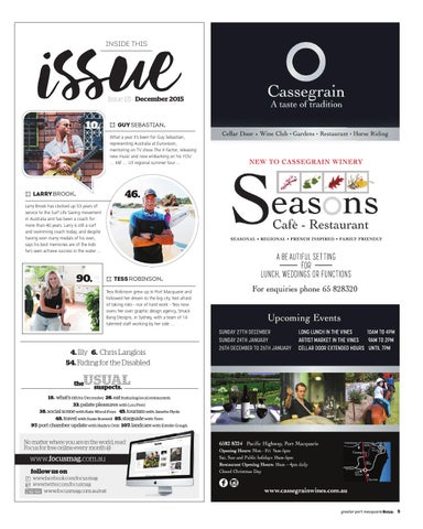 18. what’s on for December 26. eat featuring local restaurants 33. palate pleasures with Lou Perri 38. social scene with Kate Wood-Foye 45. tourism with Janette Hyde 48. travel with Susie Boswell 85. starguide with Terri 97. port chamber update with Hadyn Oriti 107. landcare with Estelle Gough