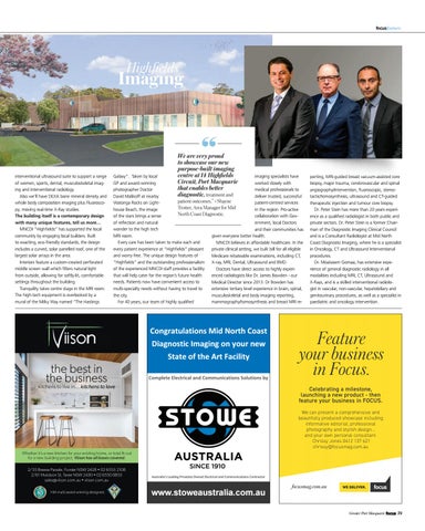 Galaxy”. Taken by local imaging specialists have GP and award-winning worked closely with photographer Doctor medical professionals to David Malikoff at nearby deliver trusted, successful patient outcomes.” - Shayne Watonga Rocks on Lightpatient-centred services Trotter, Area Manager for Mid house Beach, the image in the region. Pro-active North Coast Diagnostic. of the stars brings a sense collaboration with Govof reflection and natural ernment, local Doctors wonder to the high tech and their communities has MRI room. given everyone better health. Every care has been taken to make each and MNCDI believes in affordable healthcare. In the every patient experience at “Highfields” pleasant private clinical setting, we bulk bill for all eligible and worry-free. The unique design features of Medicare rebateable examinations, including CT, “Highfields” and the outstanding professionalism X-ray, MRI, Dental, Ultrasound and BMD. of the experienced MNCDI staff provides a facility Doctors have direct access to highly experithat will help cater for the region’s future health enced radiologists like Dr. James Bowden - our needs. Patients now have convenient access to Medical Director since 2013. Dr Bowden has multi-specialty needs without having to travel to extensive tertiary level experience in brain, spinal, the city. musculoskeletal and body imaging reporting, For 40 years, our team of highly qualified mammography/tomosynthesis and breast MRI re-