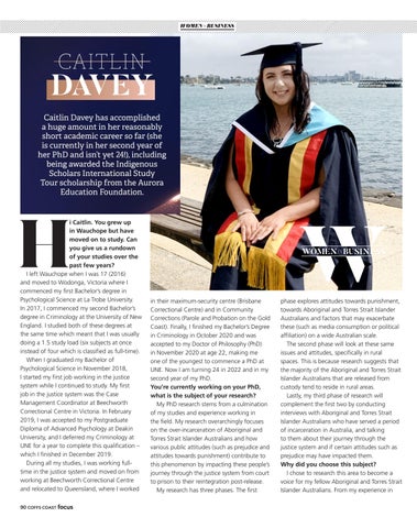 in their maximum-security centre (Brisbane Correctional Centre) and in Community Corrections (Parole and Probation on the Gold Coast). Finally, I finished my Bachelor’s Degree in Criminology in October 2020 and was accepted to my Doctor of Philosophy (PhD) in November 2020 at age 22, making me one of the youngest to commence a PhD at UNE. Now I am turning 24 in 2022 and in my second year of my PhD. You’re currently working on your PhD, what is the subject of your research? My PhD research stems from a culmination of my studies and experience working in the field. My research overarchingly focuses on the over-incarceration of Aboriginal and Torres Strait Islander Australians and how various public attitudes (such as prejudice and attitudes towards punishment) contribute to this phenomenon by impacting these people’s journey through the justice system from court to prison to their reintegration post-release. My research has three phases. The first