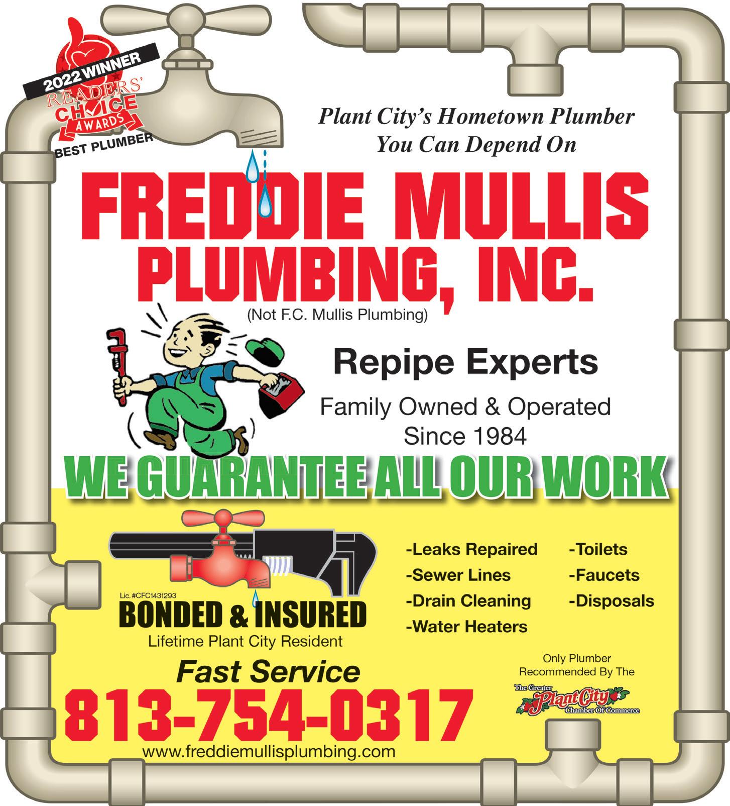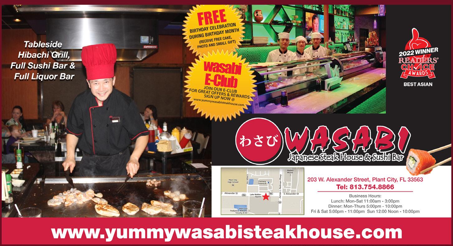 7 PAGE focusplantcity.com / Issue 21-12 / December 2022 PUBLISHER Mike Floyd mikef@floydpublications.com MANAGING EDITOR Cierra Craft cierra@floydpublications.com ART DIRECTOR Anthony Sassano asassano@floydpublications.com OFFICE MANAGER Candy Owens cowens@floydpublications.com DISTRIBUTION Tony DeVane STAFF WRITERS Cheryl Johnston Jennifer Jordan CONTRIBUTORS Candy Owens Natalie Sweet Sam Poirier Dr. Chap. Dan Middlebrooks Got a story idea? Looking to advertise in Focus? Contact us for more information. Floyd Publications, Inc. 702 W. Dr. MLK Jr. Blvd.Plant City, FL 33563 Office 813.707.8783 Standards of accuracy: The goal of the writers at FOCUS Magazine is to provide heart-warming stories that are accurate from the start. Being human, however, we sometimes make mistakes. Please forgive us. So if you notice anything that is incorrect, then please do not hesitate to contact the editorial department and inform it about the fact error. To do so, call (813) 7078783 or e-mail editorial@floydpublications.com. The staff will fix the error in a timely manner. FOCUS Magazine is published monthly and is available through local Plant City businesses, restaurants and many local venues. Advertisers warrant and represent the descriptions of their products advertised are true in all respects. Focus Magazine assumes no responsibility for claims made by advertisers. All letters and their contents sent to Focus Magazine become the sole property of Floyd Publications, Inc and may be reproduced thereof. All views expressed in all articles are those of the authors and not necessarily those of Floyd Publications, Inc. Use or duplication of material used in this publication is prohibited without approved written consent from Floyd Publications, Inc. www.focusplantcity.com FOCUS PLANT CITY