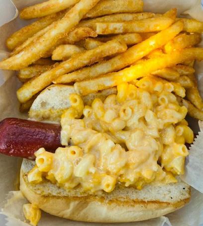 b. This mac and cheese topped hot dog and fries was just one of the unique finds at the Pig Jam. Photo courtesy: Plant City Pig Jam.