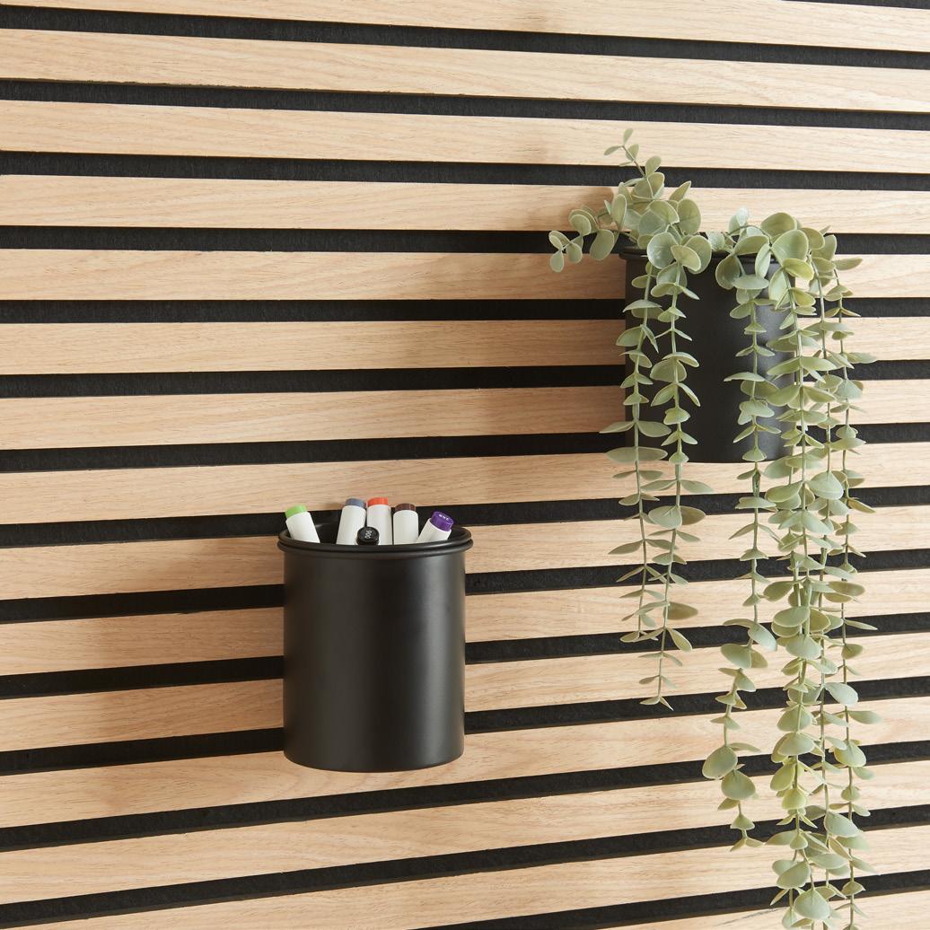 A set of three black storage cups (Ø100 mm - Ø3 15/16”) with brackets and screws for easy installation on acoustic panels. Perfect for organizing small items in offices, kitchens, and creative spaces.
