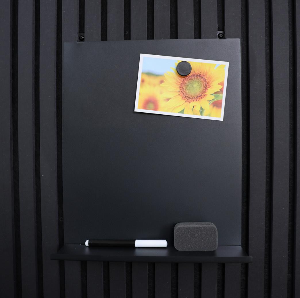 Elegante pizarra magnética negra con estante integrado y dos imanes. Perfecta para organizar notas y objetos pequeños. Diseñada para un montaje sencillo en paneles acústicos con los tornillos incluidos.