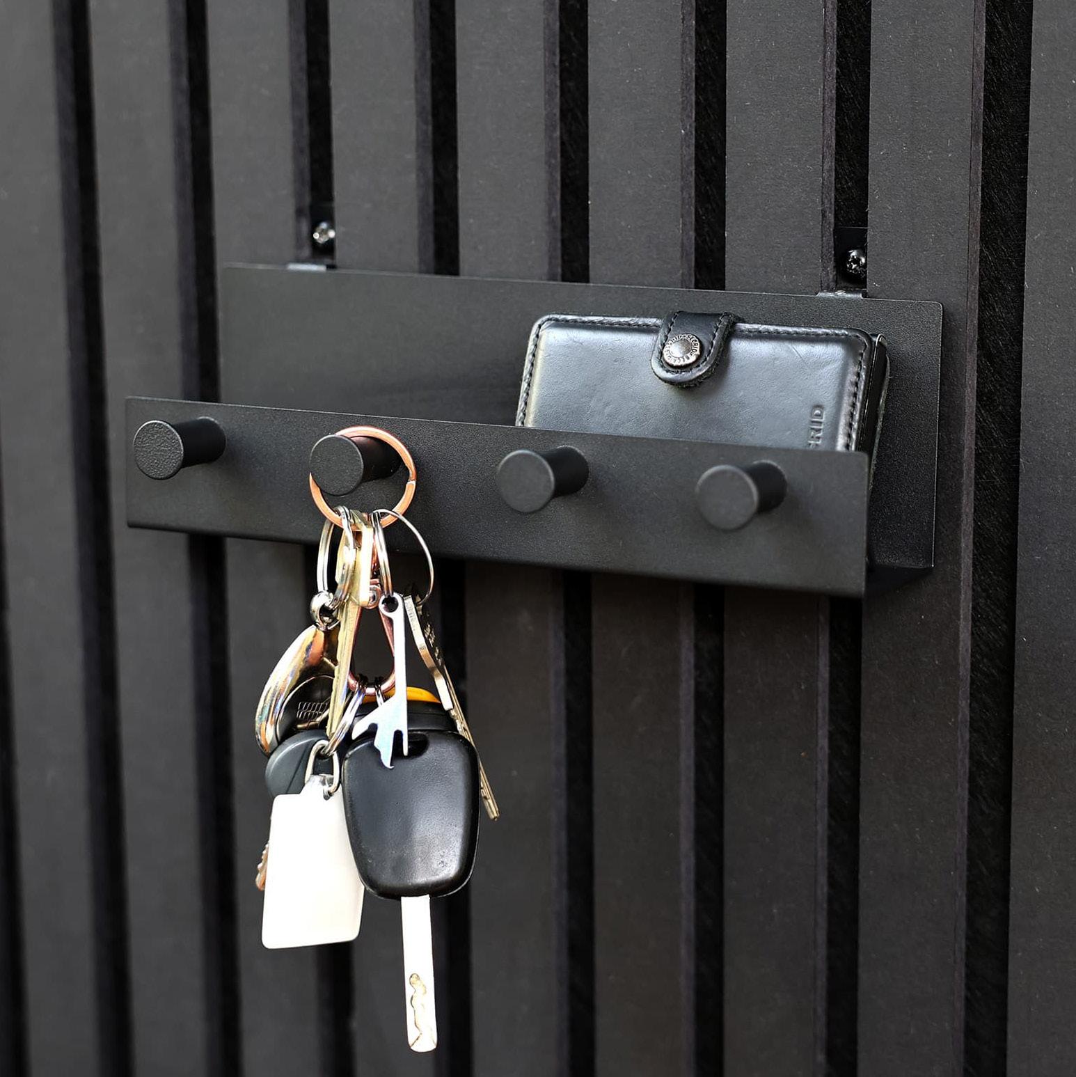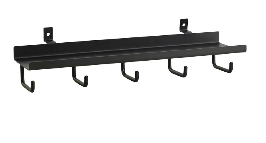 Elegante estante negro con cinco ganchos resistentes, diseñado para un montaje fácil en paneles acústicos. Ideal para organizar artículos esenciales en entradas, cocinas u oficinas. Incluye tornillos para una fijación segura.