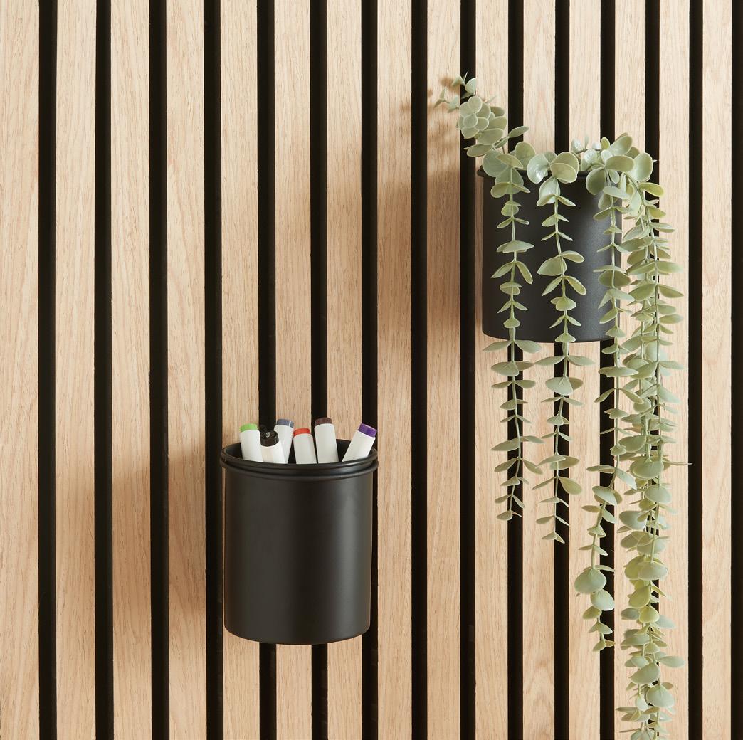 Elegante recipiente negro (Ø100 mm) diseñado para ser montado en paneles acústicos. Ideal para organizar objetos pequeños. Incluye soporte y tornillo para una instalación sencilla.